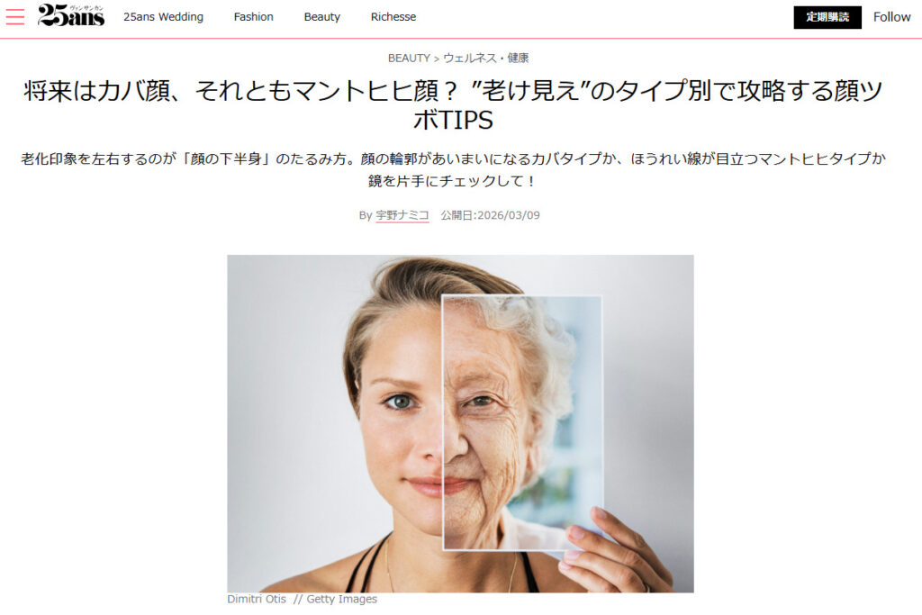 25ans(ヴァンサンカン)サイトにて2026年3月9日に、“老け見え”のタイプ別で攻略する顔ツボTIPSとして「KAOYOMIツボメソッド」を美容ライターの宇野ナミコさんがご紹介くださいました。